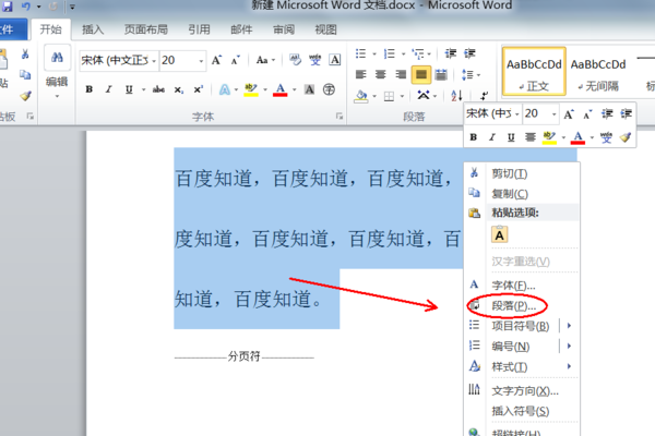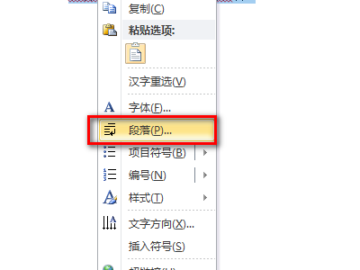 3.选中完毕后右键调出功能页面,在功能页面中点击段落选项进入段落页面,如下图所示。