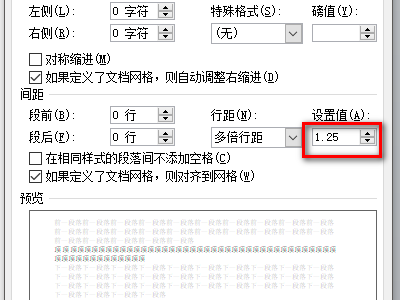 4.在段落页面中找到选行距选项,在行距输入栏中输入数字1.25,如下图所示。