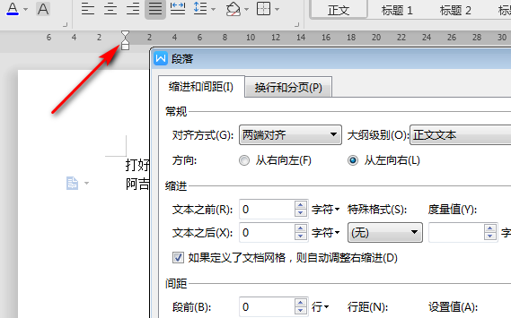 5、鼠标双击标尺中的光标,就可以弹出设置段落的窗口。