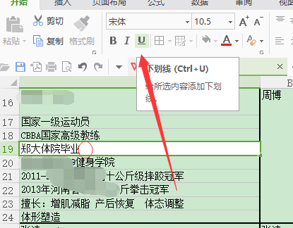 1.先在表格里边输入文字,然后在文字后点击一下下划线命令,快捷键Ctrl+U,如图所示。