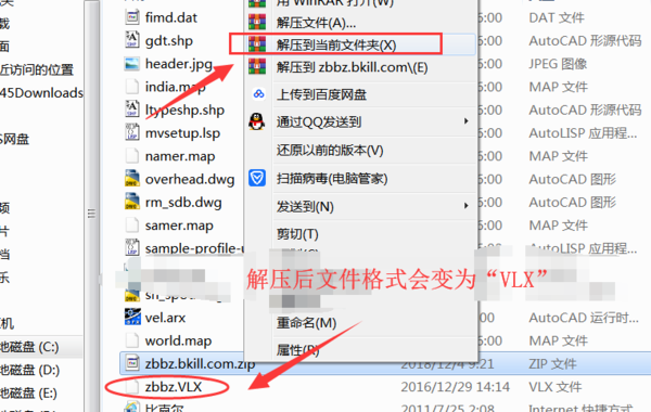 2、下载好之后,我们可以发现下载好的坐标标注插件一般是“zip”格式,那么需要先把它解压成为“VLX”格式,如果不先进行解压的话,在后面的加载过程中是找不到这个文件的。