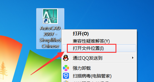 4、如果不知道自己CAD安装路径的,可以在桌面找到CAD图标单击右键在窗口下方,选择“打开文件位置”,就可以直接去到CAD文件夹。