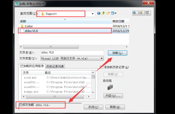 6、然后在弹出的对话框中找到Support文件夹下的坐标标注插件点击加载,看到窗口左下角显示“已成功加载”后关闭窗口。
