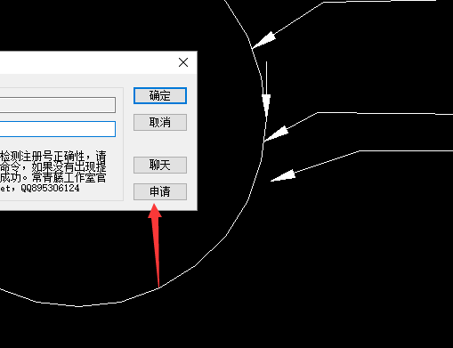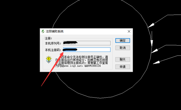 (6)将结算的注册码,填入“注册辅助系统”中的“本机注册码”,然后点击“申请”,然后确定,至此常青藤注册成功,关闭CAD软件,重新打开