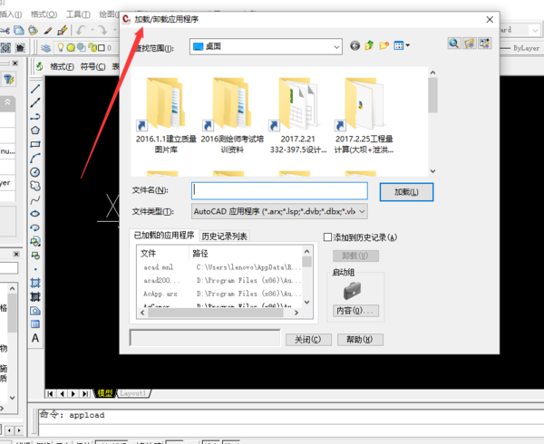 5、然后打开CAD软件,在绘图状态下输入命令“appload”,并调出程序加载窗口。