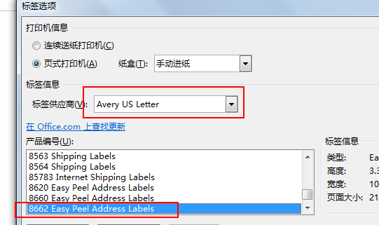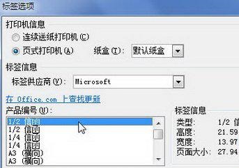 第2步,在打开的“标签选项”对话框中,用户可以在“产品编号”列表中选择标签类型,并且可以设置使用“连续送纸打印机”或“页式打印机”。完成设置单击“确定”按钮,如图所示。