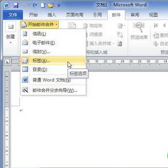 第1步,打开Word文档窗口,切换到“邮件”功能区。在“开始邮件合并”分组中单击“开始邮件合并”按钮,并在打开的菜单中选择“标签”命令,如图所示。