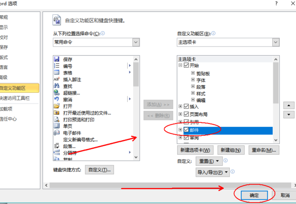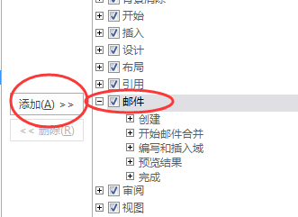 6、再点击右侧出现的“添加”,将“邮件”添加到Word的主选项卡中。