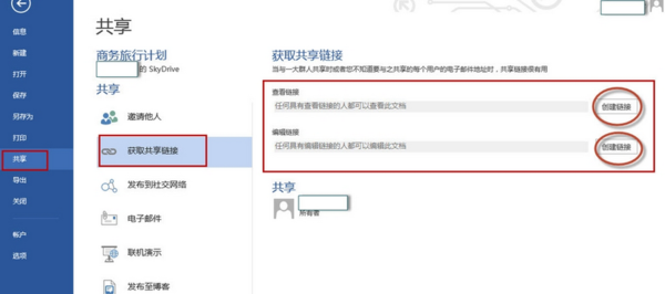 4、将文件共享给他人:选择“文件”菜单中的“共享”选项,单击“邀请他人”,输入邀请人的电子邮件(可以登录微软网盘的账号),并设置好编辑的权限,然后点击“共享”;