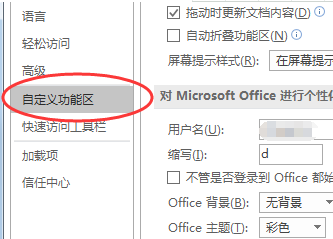 3、在弹出的选项设置框中,点击“自定义功能区”。