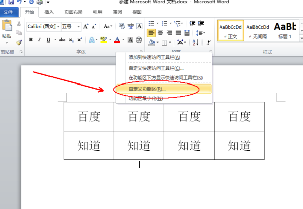 1、打开WORD文档,在工具栏任意区域点击鼠标右键,并选择“自定义功能区”。