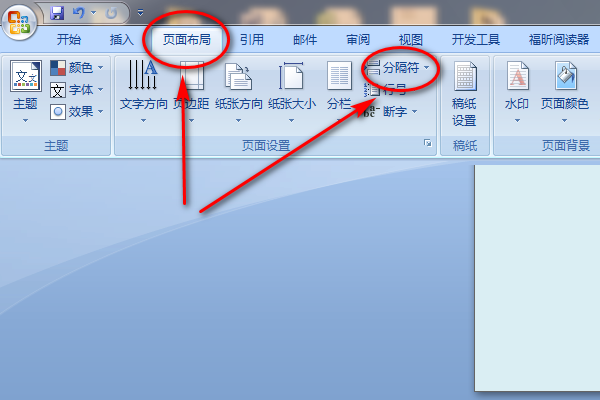 现在我们如果要把某一页设置成横向,鼠标点在该页的上一页任何地方,那么再点菜单栏“页面布局”》“分隔符”》