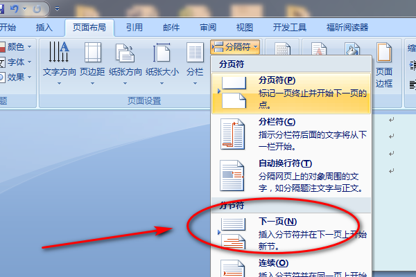 4、在分隔符的下拉菜单中选择下一页选项,在第2页与第1页之间插入分节符,使第2页与第1页分隔开。