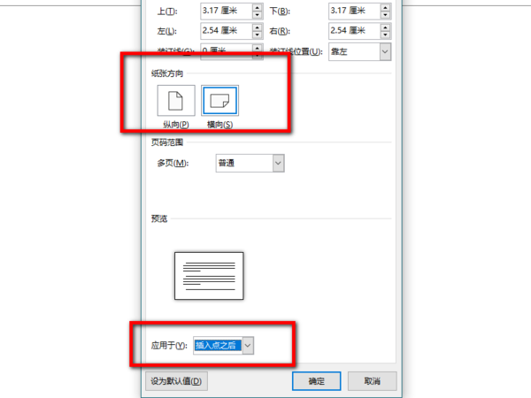 第四步,点击后弹出对话框界面选择纸张方向为横向,应用于插入点之后,点击确定。