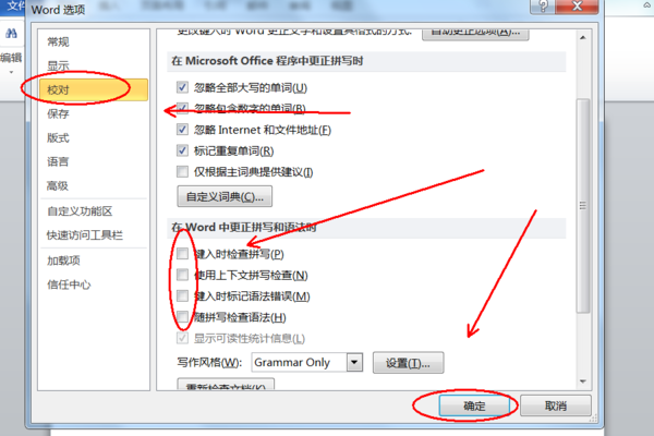 3、点击左侧的“校对”,取消右侧更正拼写语法的所有选项,然后点击确定即可。