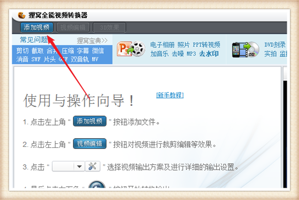 1、打开狸窝全能视频转换器,然后如下图点击箭头所指的“添加视频”。