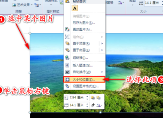 5、任意选择一张图片,并右键选择该图片,点击“大小和位置”按钮。
