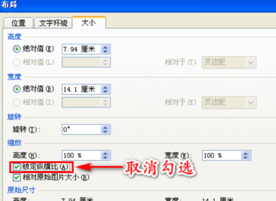 4)右击图片,选“设置图片格式”,“大小”选项卡中不勾选“锁定纵横比”,再输入高度、宽度(如2厘米、1厘米),最后确定。