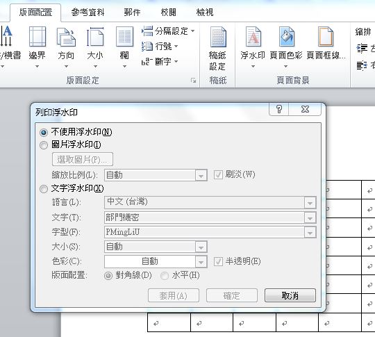 点击“版面配置-->浮水印-->自订浮水印”调出水印编辑页面。