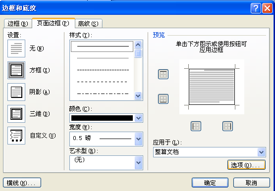 2、出现页面边框对话框,可以对边框进行设置“有”或“无”。有的的形式,还有横线的式样。如果选择方框为有,在右边就马上看到设置后效果,如图: