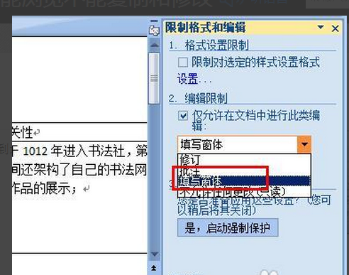 在右侧出现的“保护文档”选项卡中,勾选第2项中的“仅允许在文档中进行此类编辑”,在下拉列表中选择“填写窗体”。