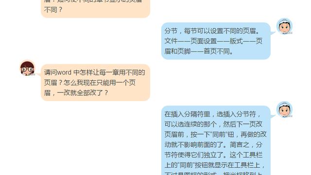 这样,你就可以在各节设置不同的页眉页脚了。举例:3、文档中有封面有正文,封面中不需要页眉页码,而正文要设置,怎么做? ①、在封面尾插入“分节符”将封面与正文分节:光标调至要插入分节符的地方,“插入”→“分隔符”→“分节符类型”“下一页”; ②、进行页眉页码编辑:“视图”→“页眉和页脚”,输入页眉内容及插入页码,这时封面和正文都将会有页眉和页码; ③、取消每节的“同上一节”设置,以便对每节进行单独编写:将光标调至第2节(即正文所在节)在页眉,点击页眉页脚编辑工具栏上的“同前”,这样就是取消“同上一节”的设置,使得两节的页眉可以分别设置(因为默认设置为“同前”),否则无论修改哪一节,另一节都会跟着改变的,同理,页脚也同样处理。