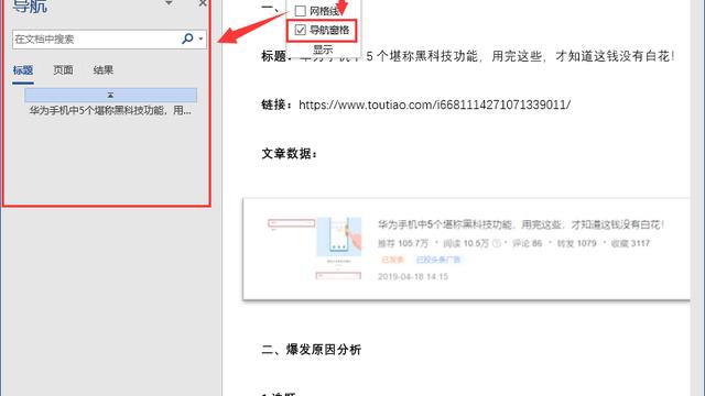 3.勾选导航窗格之后,我们就可以看到word文档左侧出现了一个导航窗口,并且在窗口中出现了文章中的一些标题。