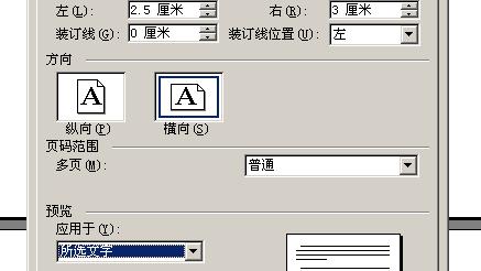 6、在打开“页面设置”对话框中,将纸张方向由“横向”改为“纵向”,再将应用于后面的下拉菜单的“整篇文档”改为“插入点之后”,之后点击右下方的“确定”按钮,这样就完成设置。