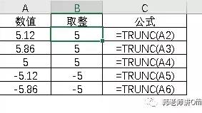除了INT(X)函数可以取整(直接去除小数部分)外,其他还有几个函数有类似功能: ROUND(X,0)进行四舍五入取整; ROUNDDOWN(X,0)向下舍入取整(相当于INT()函数的功能); FOOLR(X)向下舍入取整(相当于INT()函数的功能); EVEN(X)向上舍入取整; CEILING(X,1)向上舍入取整。