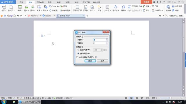 4、点击插入表格后,在弹出的菜单栏中设置表格尺寸,列数和行数根据需求设置更改数据,单击确认完成。