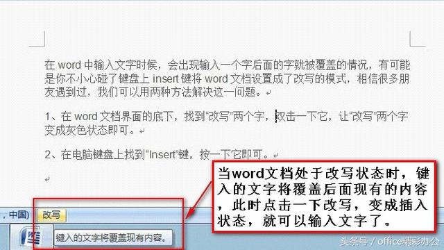 1. 如图所示,打开Word文档,单击左下角处的“改写”状态按钮,或者按“Insert”键,使其显示为“插入”字样。