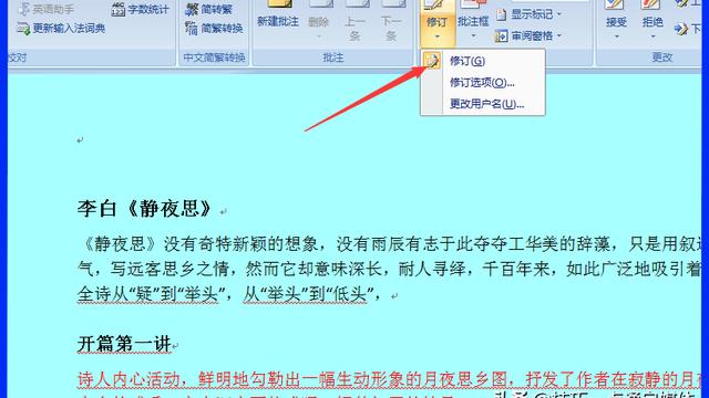 首先打开需要修订的word文档,然后在菜单栏中选择审阅,再点击修订打开word修订模式。