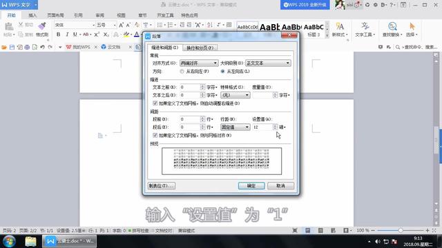 在“缩进和间距”选项卡,单击打开“行距”的下拉菜单,选择“固定值”,并设置值更改为“1磅”