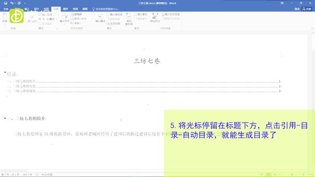 第四步:在所有标题的样式设置完成之后,就可以添加目录了,将光标定位到要添加目录的地方,word选中“引用”选项卡 第五步:在工具栏的最左边,有“目录”,点击目录,选择“自动目录1”,这样就自动生成目录了 第六步:当标题发生变化时,可以选中目录,点击“更新目录”按钮,选择“更新整个目录”,这样目录就会自动更新了。 。
