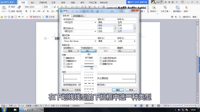 第二种方法:选中需要添加下划线的文字段落后,点击鼠标右键,弹出菜单中选择“字体(F)”,然后弹出窗口中间部位,找到“下划线类型”选项,将下划线设置为您需要的样式后,点击“确定”即可打出下划线;