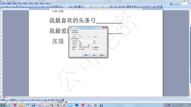 选中“文字水印”单选钮,激活该栏内容,在“文字”下拉列表框中,选择水印的文字内容,在“字体”、“尺寸”和“颜色”下拉列表框中,分别选择水印文字的字体、字号和字体颜色。设置完成后,单击“确定”按钮,即可在文档中央显示水印 如果要删除水印效果,则在“水印”对话框中,选中“无水印”单选钮,再单击“确定”按钮即可。
