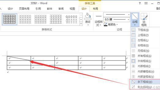 选中需要绘制斜线表头的空白单元格,继续选择“设计”——“表样式”选项组中——“边框”按钮——边框和底纹。