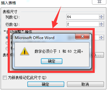 接着就会弹出来提示窗口,提示”数字必须介于1和63之间“了,因此插入表格的时候,列数不能设置大于63的数值。