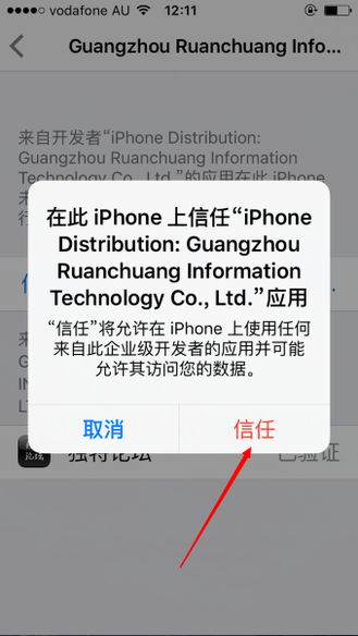 六、然后在弹出的页面中点击“信任”按钮,点击完信任按钮后,再次打开App就可以正常运行了。
