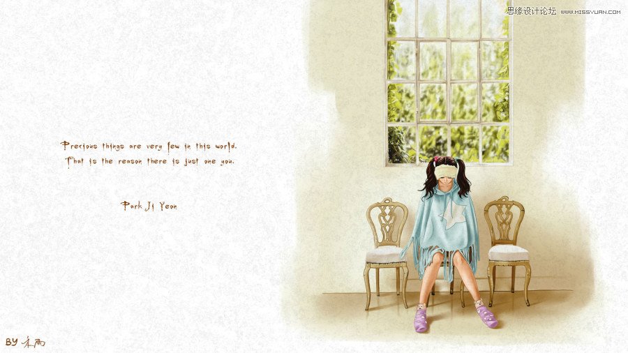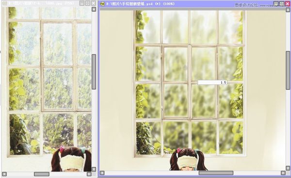 接下来画窗户和植物,窗户部分新建图层铺色,窗框和植物分开建立图层,先画近距离的植物,后画模糊的部分。
