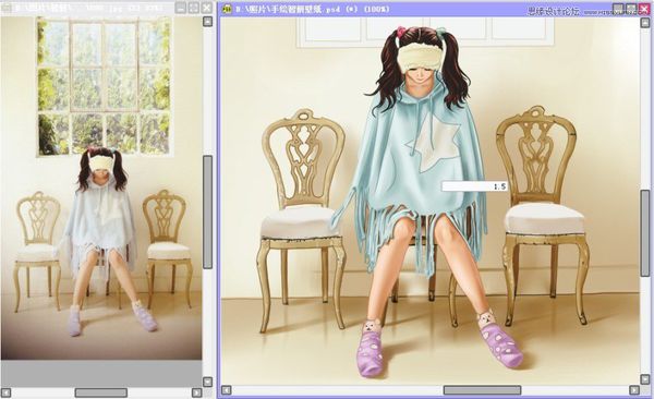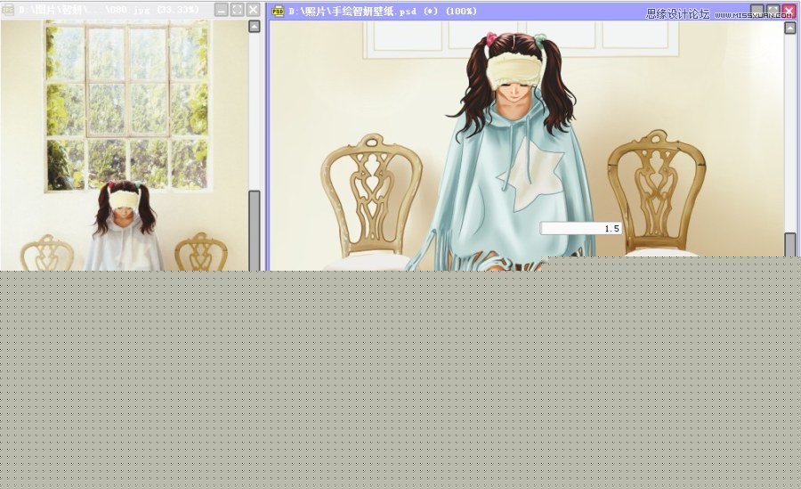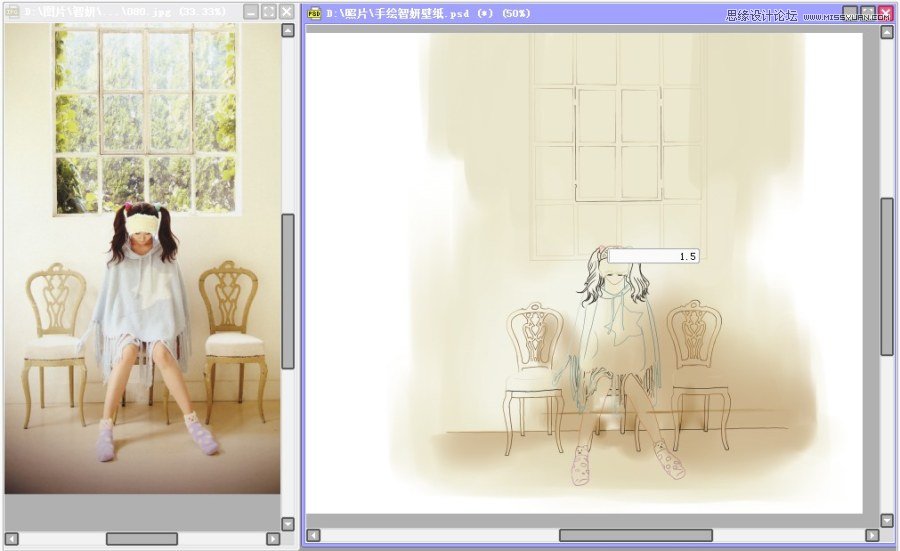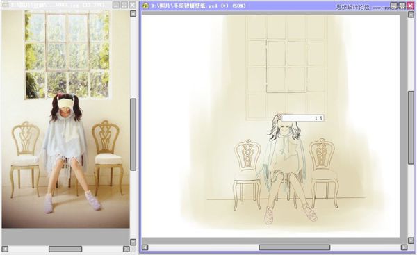 隐藏原图片为不可见,另外打开原图,和手绘稿并排显示于主窗口。