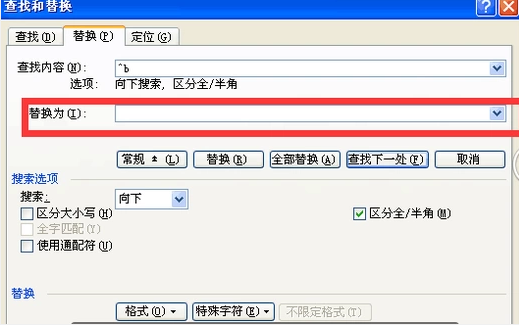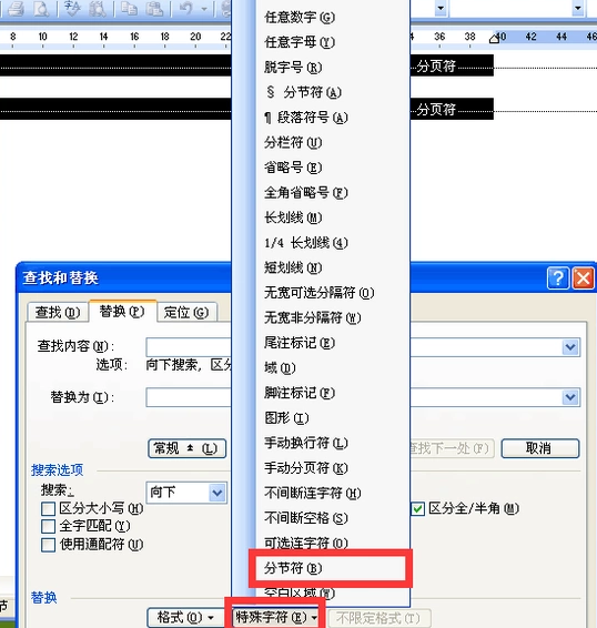 5、由于例文的正文中只有分节符,这里只在下拉菜单中点选“分节符”,在“查找内容”输入框中就会被输入“^b”字符。