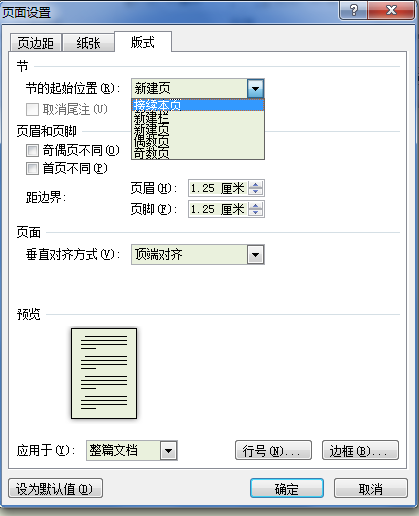 【板式】选项卡的第一个选项可以调节“分节符”的起始位置,默认是“新建页”。我们根据需要改成“接续本页”即可。