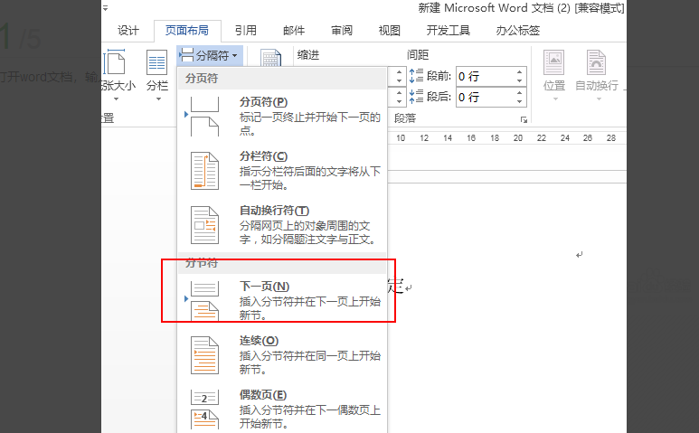 3、点击“页面布局”-“插入分页符和分节符”-“下一页”。