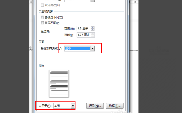 4、回到文档起始位置,点击“页面布局”-“页面设置”-“版式”应用于节,垂直对齐方式为居中,点击确定。
