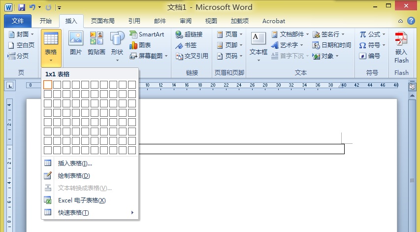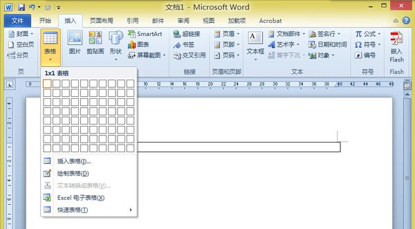 第一步:新建或打开Word文档,切换到“插入”选项卡,如图,单击“表格”按钮,插入一个一行一列的表格。