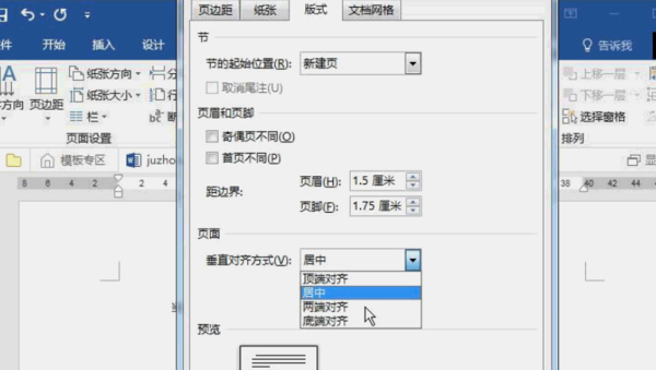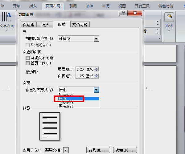 2、弹出页面设置对话框,选择版式选项卡,在垂直对齐方式处选择居中即可。
