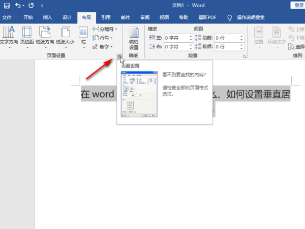 3、垂直居中(上下居中),布局——页面设置——点击下拉键——展开页面设置窗口