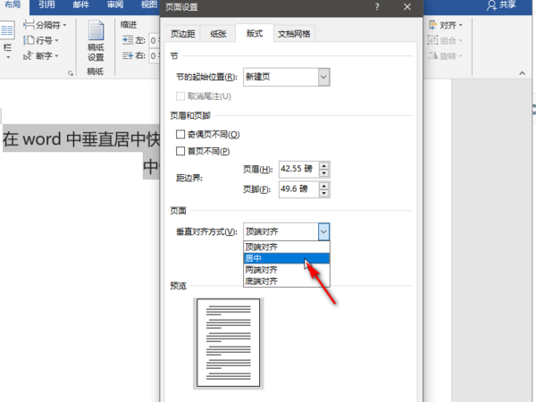 5、然后在页面设置对话框的“版式”页面将垂直对齐方式设置为“居中”,点击确定后即可对文字进行垂直居中设置。
