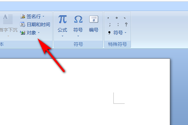 2、然后在插入的目录下面,找到对象,点击对象下的倒三角形。